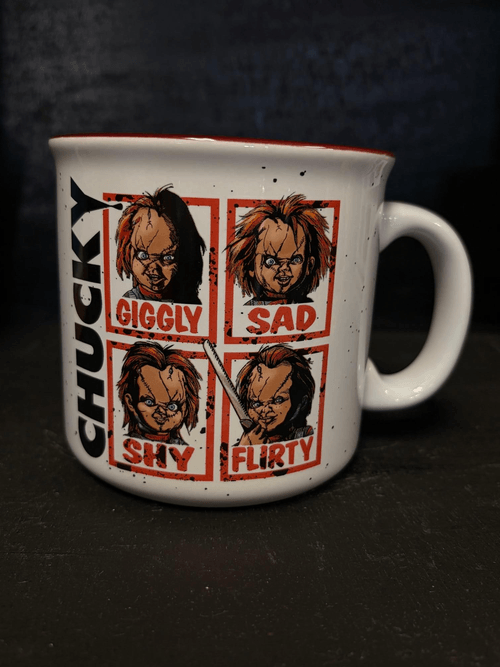 Child's Play Chucky Emotions Ceramic Camper Mug 20 oz, Great mug for Chucky collectors or gifting for a horror fan. This mug express all the different emotions order yours before they are gone.